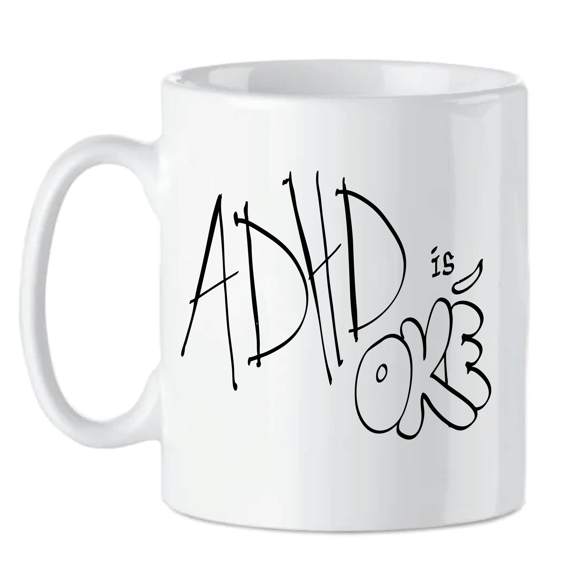 Koffietas met opschrift 'ADHD is oké' en een illustratie die een inkijk geeft in Pieters leefwereld.